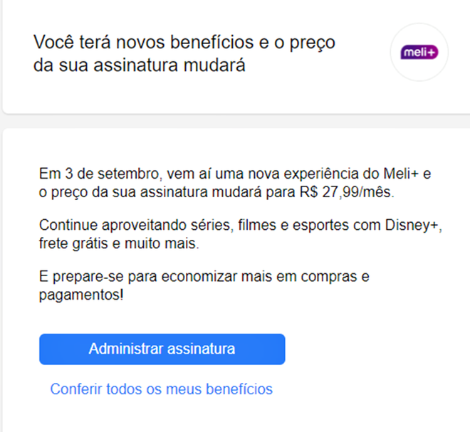 A mensagem do Mercado Livre menciona novos benefícios, contudo, ainda não há mais detalhes sobre quais seriam. Assim Meli+, que contava com o combo do Disney+ antigo e o Star+ (o novo Disney+ Premium), agora oferece o Disney+ Padrão com anúncios, a um preço maior — daí a bronca dos usuários.