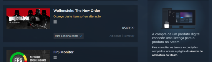 Aviso de que o usuário está comprando uma licença de uso aparece à direita no carrinho de compras da Steam (Imagem: Captura de tela/Jones Oliveira)