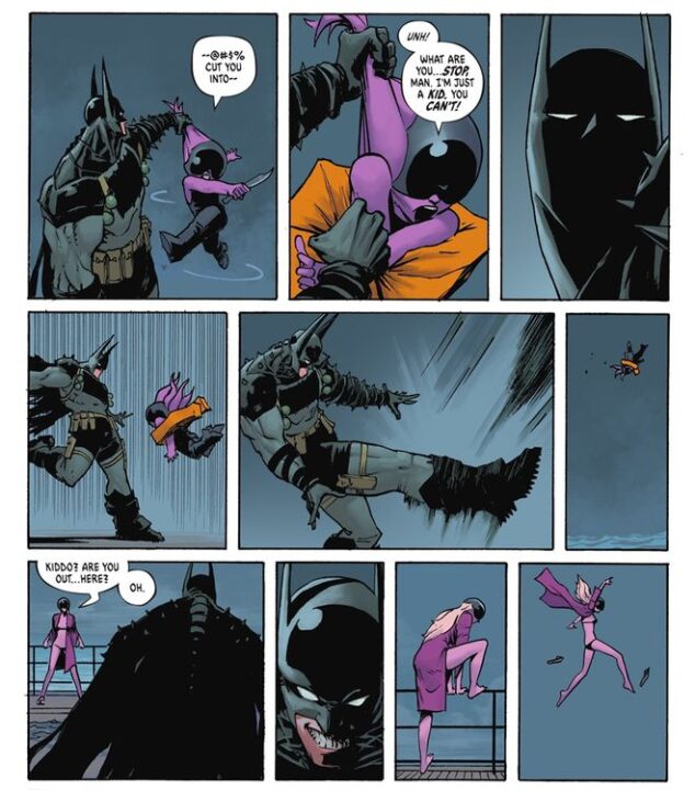 O menino mais novo tenta esfaquear Batman, que o segura pelas antenas e joga para cima para emendar aquela bicuda “de primeira”, sem deixar o garoto cair do chão, com a mesma beleza de movimentos caracterizada por um chute “na veia” da bola de uma partida do Brasileirão — tão violento e hilário que chega a ser divertido.
