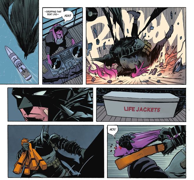 Depois de uma investida mal-sucedida na edição anterior, Bruce se recompõe e pede a ajuda de amigos, revelando que é o Batman Absoluto. Em seguida, ele invade o iate Máscara Negra já usando um dos filhos do vilão, que é DJ, como “pista de pouso”.