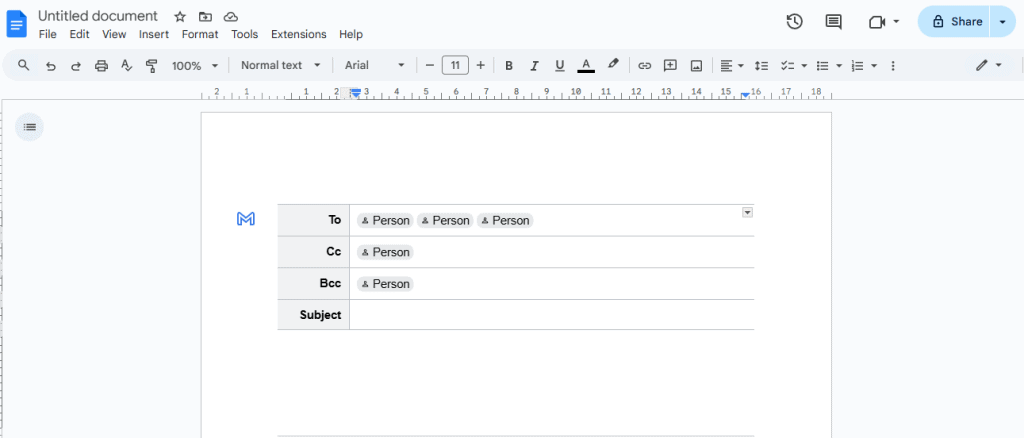 Para usar, clique em “Inserir”, “Elementos Básicos” e “Rascunho de e-mail”. Também é possível digitar @email no documento e pressionar enter. Depois do rascunho criado, você pode adicionar destinatários nos campos, adicionar linhas de assunto, escrever o corpo do e-mail, formatar e enviar par ao Gmail.