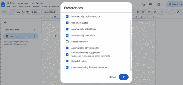 Se quiser ativar ou desativar o Smart Compose no Google Docs, você pode clicar em “Ferramentas”, “Preferências” e clicar na caixinha de “Mostrar sugestões da Composição Inteligente”. Então, é só clicar em “OK”.