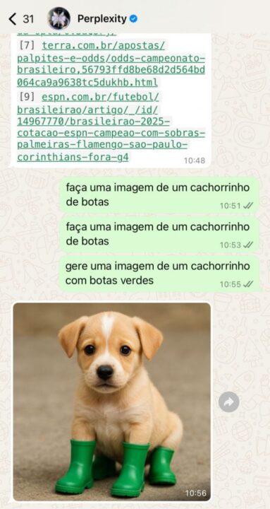 A novidade foi compartilhada pelo CEO da Perplexity, Aravind Srinivas, em suas redes sociais na segunda-feira (28). Ele revelou que, na versão integrada ao aplicativo mensageiro, é possível obter respostas com fontes e gerar imagens.