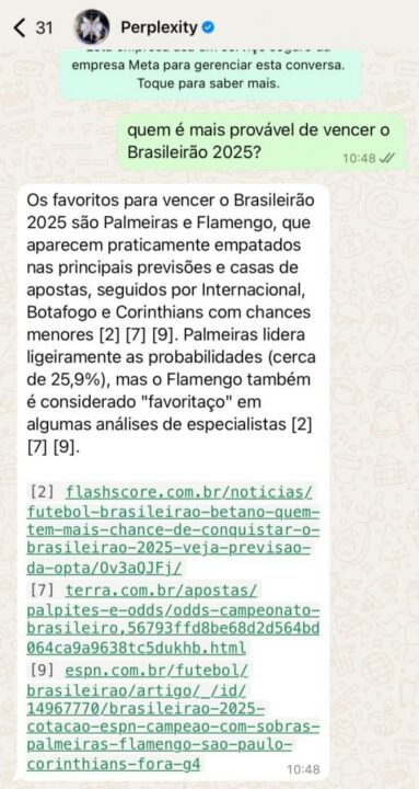 A Meta AI ganhou competição no próprio quintal. Isso porque a inteligência artificial da Perplexity, conhecida por suas respostas com base em fontes da internet, chegou ao WhatsApp.
