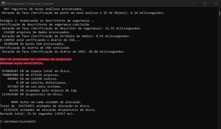 - O processo pode demorar mais em HDDs e é mais rápido em SSDs. Caso esteja escrito “Não há problemas no sistema de arquivos. Nenhuma ação necessária” no fim do relatório, significa que seu drive de armazenamento está em boas condições.
