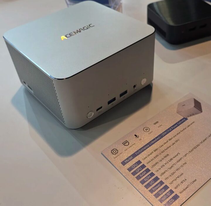 Saindo do setor nostalgia, a Acemagic está lançando também outros dois modelos, que são no formato caixa, com hardware da Intel. O model o topo de linha oferece nada menos que o recém lançado Core Ultra X9 388H, CPU topo de linha Panther Lake com 16 núcleos, além da iGPU Arc B390, que consegue empatar com a placa de vídeo Radeon RX 6600 em games. Esse modelo é destravado para operar em 120W, oferecendo clocks mais altos por mais tempo.