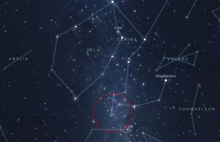 Localização do aglomerado aberto Poço dos Desejos (C91), na Constelação de Carina. Crédito: Stellarium Web