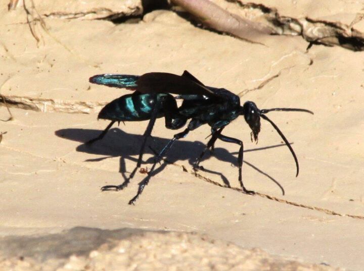 Diferentemente do restante dos insetos, essas vespas são imponentes, visto que podem atingir 5 cm de comprimento, mas algumas atingem 7 cm. Seu corpo possui tons metálicos de azul-escuro ou preto, é brilhante, detém asas alaranjadas ou escuras, e pernas longas como ganchos. Enquanto as fêmeas têm ferrão funcional, os machos, não; além disso, as antenas das fêmeas são mais curvas.