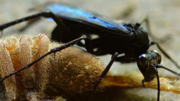 Esse veneno não é letal, mas paralisante, capaz de impedir que a aranha se movimente por semanas, dependendo do tamanho do aracnídeo. Uma vez paralisada, a aranha é transportada pela vespa até um local seguro; lá, o inseto deposita um único ovo dentro da tarântula e depois cobre o esconderijo para que nenhum outro bicho interrompa o processo de nascimento.